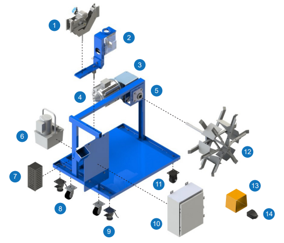 Integral cutter for up to 2” diameter material Weighted base for stability Variable speed control 1 HP SCR drive system, 120 V 1 PH., 0-70 RPM Feet & inch mechanical counter 2 swivel wheels for maneuverability Operator safety foot switch 5C-6HD Collapsible coiler 20” ID x 30” OD x 5” wide