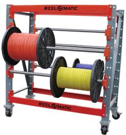 Mobile Reel Rack Cart(REELRACK-61) : Reelpower Industrial “Mobile” Reel Rack Cart is manufactured with 3” Structural Steel to withstand many years of use. Components include upright frames, crossbeams, front-frame hanging brackets, solid steel reel axles, two fixed wheels, two rotating casters with brakes, push handles (for steering) and a galvanized-steel lower shelf pan for storage.