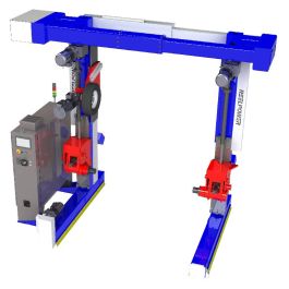 Gantry Style Shaftless Take-up for reels measuring 60” to 96” OD X 36” to 60” wide X up to 30,000 lbs. maximum weight capacity.
